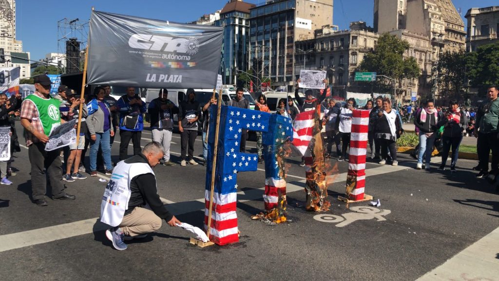 Minutos después, sobre la 9 de Julio, un grupo de compañeros y compañeras de distintas organizaciones prendieron fuego las siglas del FMI realizadas en cartón, con los colores de la bandera de Estados Unidos, al grito de «Patria sí, colonia no».