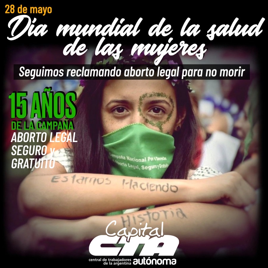 Este 28 de mayo estamos cumpliendo 15 años de participación en la Campaña Nacional por el Derecho al Aborto Legal, Seguro y Gratuito. Este 28 de mayo nos encuentra sosteniendo la cuarentena y defendiendo la vida en viejas y nuevas trincheras, en casa, en el trabajo, en el barrio. La bronca y la angustia son grandes como los riesgos para nuestra salud y la de quienes cuidamos pero más grande es el amor, la solidaridad y nuestra concepción política de que para defender la vida es indispensable organizarnos contra este sistema capitalista y patriarcal para el que no valemos nada. Este 28 de mayo tan particular queremos desde la CTA A Regional Capital saludar y abrazar especialmente a aquellas compañeras de nuestra central, trabajadoras comunitarias, trabajadoras del Estado, del sector privado y no estatal que más que nunca nos están cuidando, que sostienen la vida y pelean por ella.