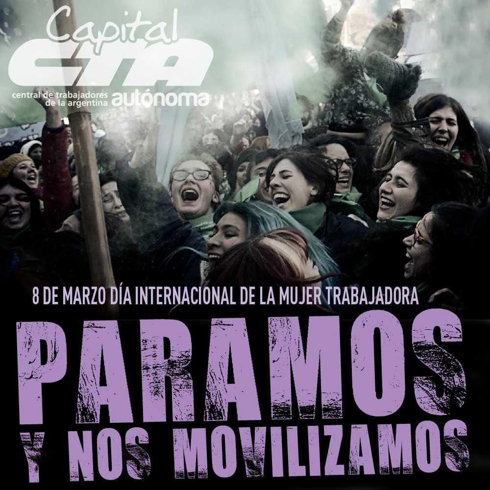 Este viernes 8 de marzo, Día Internacional de la Mujer Trabajadora, las compañeras mujeres, lesbianas, trans y travestis de la CTAA Capital se concentrarán a las 16 horas en Avenida Belgrano y 9 de Julio para marchar hacia la Plaza de Mayo, en el marco del Paro Internacional de Mujeres.