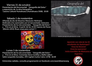 geografia.redimensionadoEste lunes 3 de noviembre a las 18.30 horas se presentará en el Salón Leopoldo González de ATE Capital -Carlos Calvo 1378- los documentales “Geografía del Dolor” y “Frío en el Alma”, de Mónica González -Premio Nacional de Periodismo México 2011- e Iván Castaneyra -Primer lugar en fotografía del premio Rostros de la Discriminación México 2014- sobre los 43 desaparecidos en México. Participarán de dicha actividad Nora Cortiñas, Madres de Plaza de Mayo Linea Fundadora y la periodista e investigadora Stella Calloni.