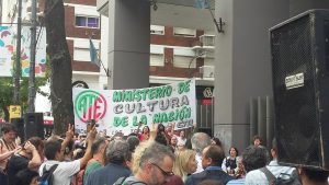 Por su parte, Manuel Cullen, delegado General de la Secretaría de Cultura de la Nación agregó: “Hoy nos estamos movilizando en el Congreso porque es el día en que se trata el presupuesto 2019, tendría que salir con dictamen negativo y estamos llamando la atención de los legisladores para que no avancen con el recorte brutal a la Cultura que están proponiendo Mauricio Macri y el FMI. Este ajuste implica menos libros, menos subsidios para bibliotecas populares; significa que la orquesta sinfónica no va a tener recursos; significa que los museos se sigan cayendo a pedazos; significa en definitiva menos acceso a la cultura para los ciudadanos de nuestro país y significa que el mercado sea quien regule quien puede acceder a un museo, a un teatro o a una función de música”.