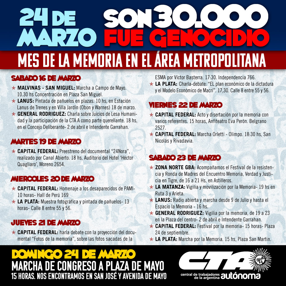 Durante todo el mes de marzo, las distintas organizaciones de la Central porteña estarán realizando actividades en torno a la Memoria, la Verdad y la Justicia. El 24 de Marzo se movilizará como cada año, la marcha será de Congreso a Plaza de Mayo (Nos encontramos en San José y Avenida de Mayo, a las 15 horas).