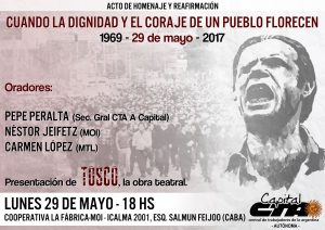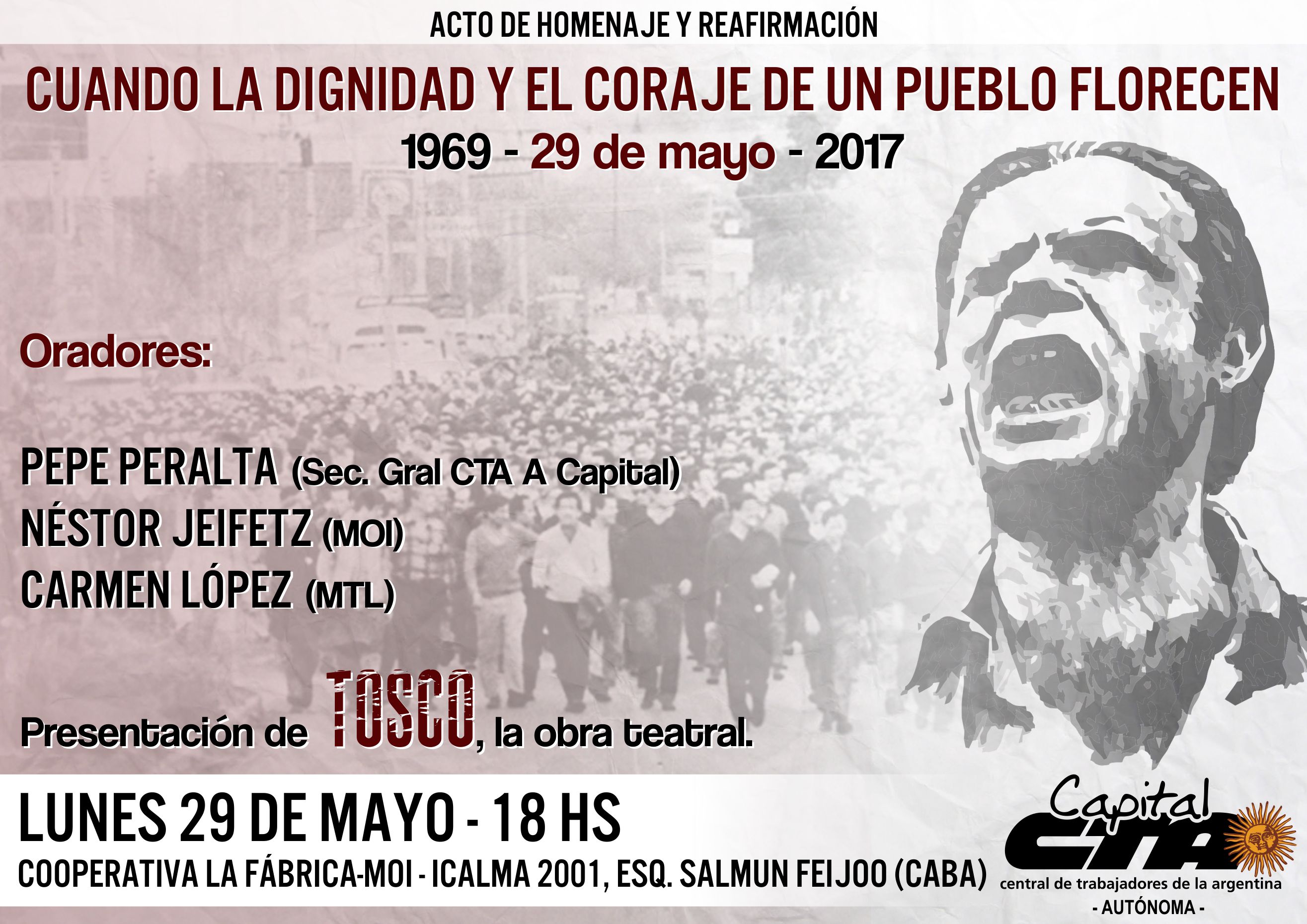Ante un nuevo aniversario de la histórica rebelión popular de 1969, el “Cordobazo”, la CTA Capital invita a participar del acto en su conmemoración que se realizará este lunes 29 de mayo, a las 18 horas en la Cooperativa La Fábrica-MOI, ubicada en Icalma 2001, esquina Salmun Feijoo, barrio de Barracas.