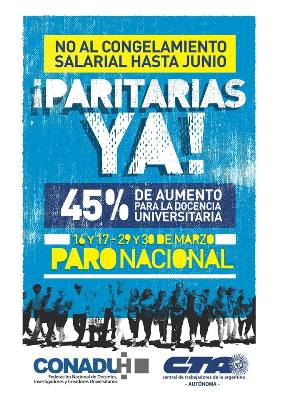 Asimismo agregó que “es un paro que no solo lo están realizando el total de las asociaciones de base de la CONADU Histórica, sino que se han sumado también las asociaciones gremiales de docentes de Río Cuarto y Rosario las cuales están enroladas en la otra federación”. Tiscornia concluyó exigiendo “la inmediata constitución de las paritarias y una negociación seria para que se definan en el mes de marzo los salarios docentes para el año 2016”.
