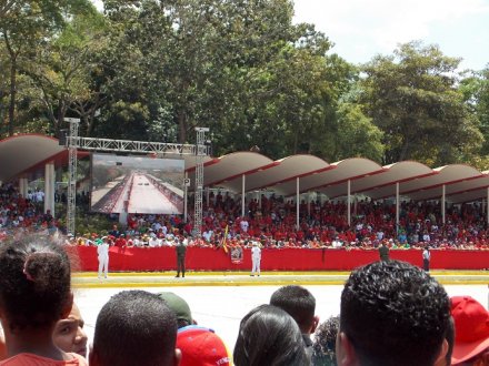 Más de una hora de cola tuvieron que hacer para poder observar el desfile cívico y militar realizado en el paseo Los Próceres de Caracas, la capital de Venezuela. El presidente Nicolás Maduro informó que “la derecha fascista intentó cortar los accesos a Caracas, pero no pudieron lograr que la revolución homenajeara al comandante supremo, Hugo Chávez”. A coro, la multitud le respondió “así, así, así es que se gobierna”. Maduro replicó con un cántico popular que ha se hizo emblema de la revolución: “Chávez vive, vive, la lucha sigue, sigue” que fue repetido por los y las presentes.