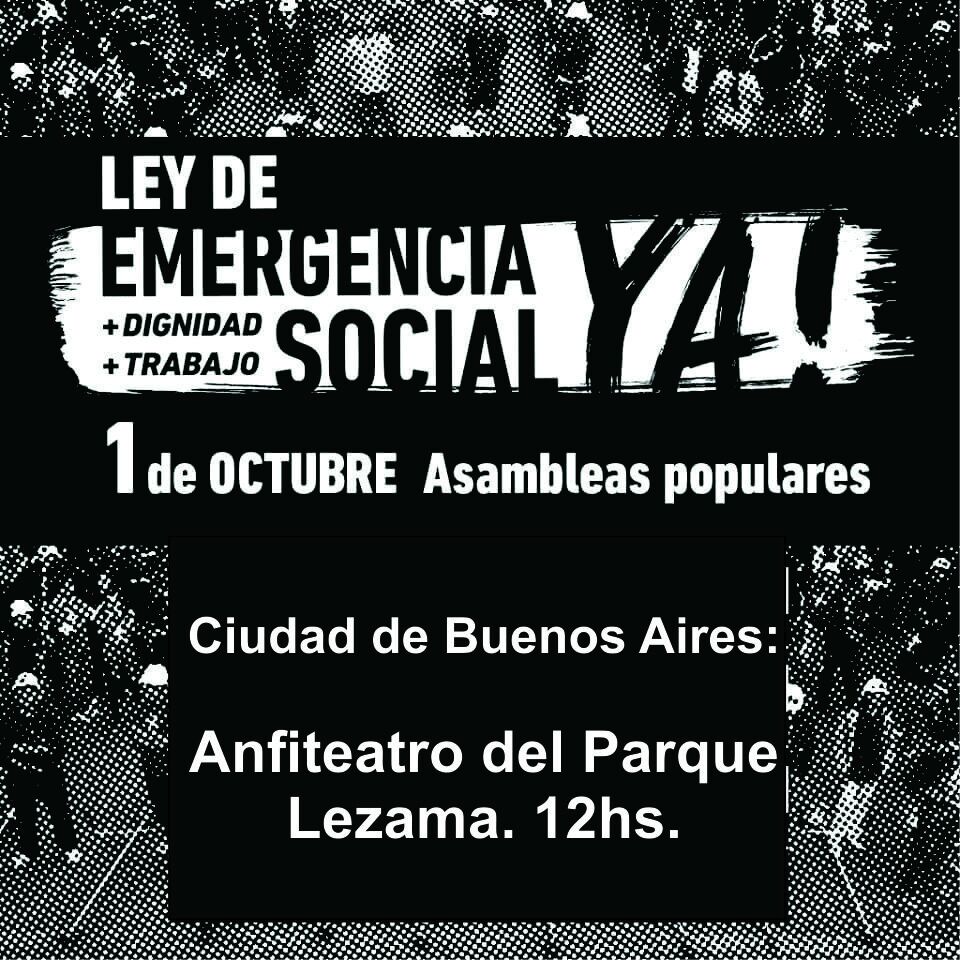 En el marco de la propuesta realizada a las Cámaras Legislativas Nacionales para la declaración de la Emergencia Social; las organizaciones que replican la misma iniciativa en la Ciudad de Buenos Aires, se reunirán en Asamblea Popular el sábado 1º de octubre a partir de las 12 horas en el Anfiteatro del Parque Lezama para debatir y comunicar las acciones y nuevos pasos a seguir.