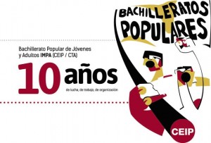 Primero de más de 70 bachilleratos populares hoy existentes y de los 10 bachilleratos que sostiene como organización la CEIP, el Bachillerato Popular de Jóvenes y Adultos IMPA transita en este 2014 su décimo año de funcionamiento, camino que se recorrió junto a otras organizaciones del campo de lo popular, interpelando al Estado por el reconocimiento del papel protagónico que necesariamente tienen que tener las organizaciones sociales para la mejor educación de nuestro pueblo. Diez años de lucha, haciendo de la lucha una praxis pedagógica y una instancia de saber; 10 años de trabajo, en el que como trabajadores de la educación nos encontramos dando la batalla por una escuela pública popular; 10 años de organización, porque sin organización y sin la autogestión de la mano de sus trabajadores, no hay práctica revolucionaria posible.