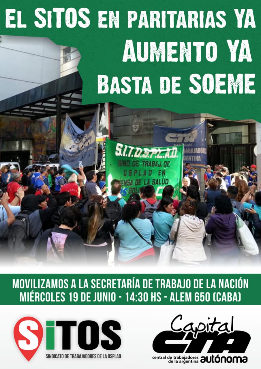 Este miércoles 19 de junio las y los trabajadores de la Obra Social Docente se movilizarán nuevamente a la Secretaria de Trabajo (Alem 650) para rechazar las paritarias truchas que esta llevando adelante la intervención del SOEME con la OSPLAD y para exigir que sea el SiTOSPLAD el sindicato paritario, ya que es el único que tiene el ámbito correspondiente y mayoría de afiliados.