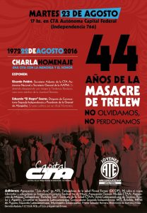 Hoy martes 23 de agosto a las 17 horas en la sede de la CTA Capital -Avenida Independencia 766- se realizará una Charla Homenaje al cumplirse 44 años de la masacre de Trelew. Bajo el lema “Una cita con la memoria y el honor”, expondrán Ricardo Peidro y Eduardo “El Negro” Soares, en esta actividad organizada por Jóvenes de ATE ANUSATE y la Central porteña.