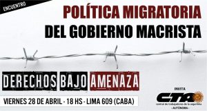 La CTA Autónoma promueve un encuentro para este viernes 28 de abril a las 18 horas en Lima 609, con la intención de tratar la problemática de las nueva modificaciones a la Ley Migratoria, intercambiar información y pensar alternativas de resistencia en pos de la igualdad de todas las personas.