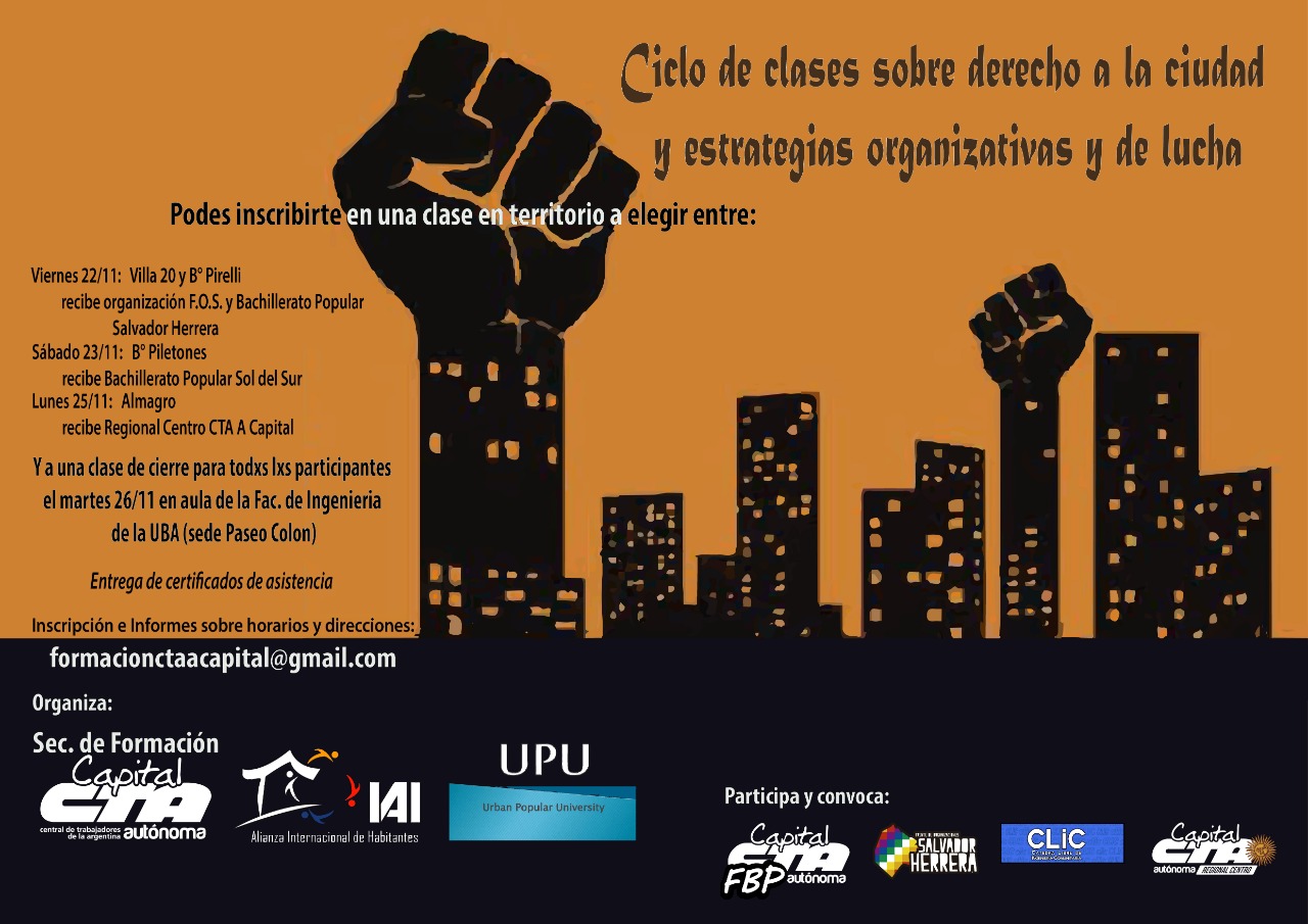En el marco de la articulación estratégica entre la Central de Trabajadores de la Argentina – Autónoma de la Regional Capital y la Alianza Internacional de Habitantes y con la presencia y participación especial del Profesor Alessio Surian, se realizará un Ciclo de clases sobre el Derecho a la Ciudad y estrategias de organización y lucha, con el objetivo de contribuir al fortalecimiento y formación política de las experiencias organizativas y de lucha relacionadas a las problemáticas urbanas de esta ciudad excluyente y expulsora pero disputada por sus habitantes y organizaciones cada día.