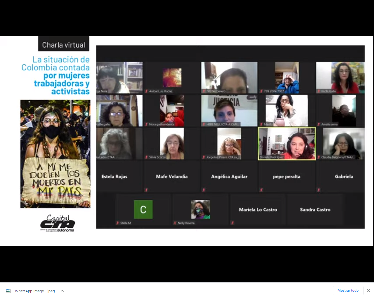 La CTAA Capital continuará difundiendo lo que sucede en Colombia, fomentando la solidaridad entre los pueblos y sumando voces al grito de miles de mujeres del pueblo colombiano alzado, que más tarde o más temprano vencerá. Ver la charla completa en https://www.youtube.com/watch?v=vVSUQpjeNLY
