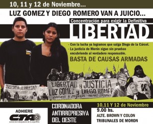 El lunes 10 de noviembre comienza en los tribunales de Morón el juicio contra Luz Gómez y Diego Romero, acusados de haber matado a un hombre en el marco de un intento de robo en 2011. La pareja es enjuiciada porque olvidaron una mochila con pañales y papeles de vacunación de su hija en un remís, que luego apareció en la escena del crimen. Todas las pericias dieron negativo, pero igualmente serán enjuiciados.