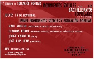 Durante los días 17, 18 y 19 de noviembre se va a realizar el Primer Congreso de Educación Popular y Movimientos Sociales desde los Bachilleratos Populares. Para hablar sobre esto desde Estación Central (Radio Sur, FM 88.3) se comunicaron ayer con Daniela Rodriguez, del Frente de Bachilleratos Populares de la CTA.