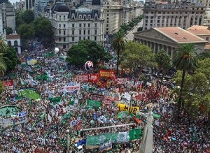 Apenas pasada la media mañana comenzaron a sentirse en todas las calles del microcentro porteño los bombos que anunciaban la llegada de columnas de trabajadores a la intersección de 9 de julio y Avenida de Mayo, donde las bengalas teñían el cielo de color verde.