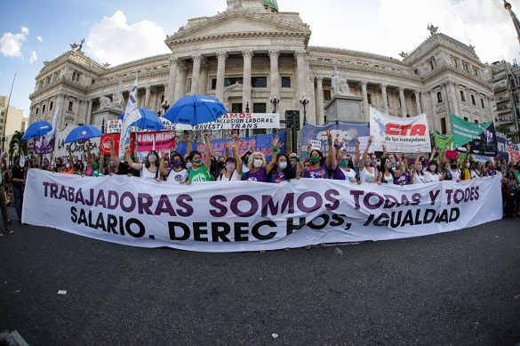 Por su parte, Clarisa Gambera, Secretaria de Género de CTAA Capital, indicó que se trató de un contexto difícil en términos sanitarios pero que se acordó desde las diferentes organizaciones estar en la calle: «Es el lugar donde nos ven y podemos estar juntas para seguir avanzando en una agenda de las trabajadoras que habla de la crisis de los femicidios que no podemos detener, que exige una reforma judicial porque nos dan la espalda, las fuerzas de seguridad no nos cuidan. En un contexto donde los salarios de las estatales no alcanzan, que van más lento que la inflación, que la crisis habitacional y de cuidado.