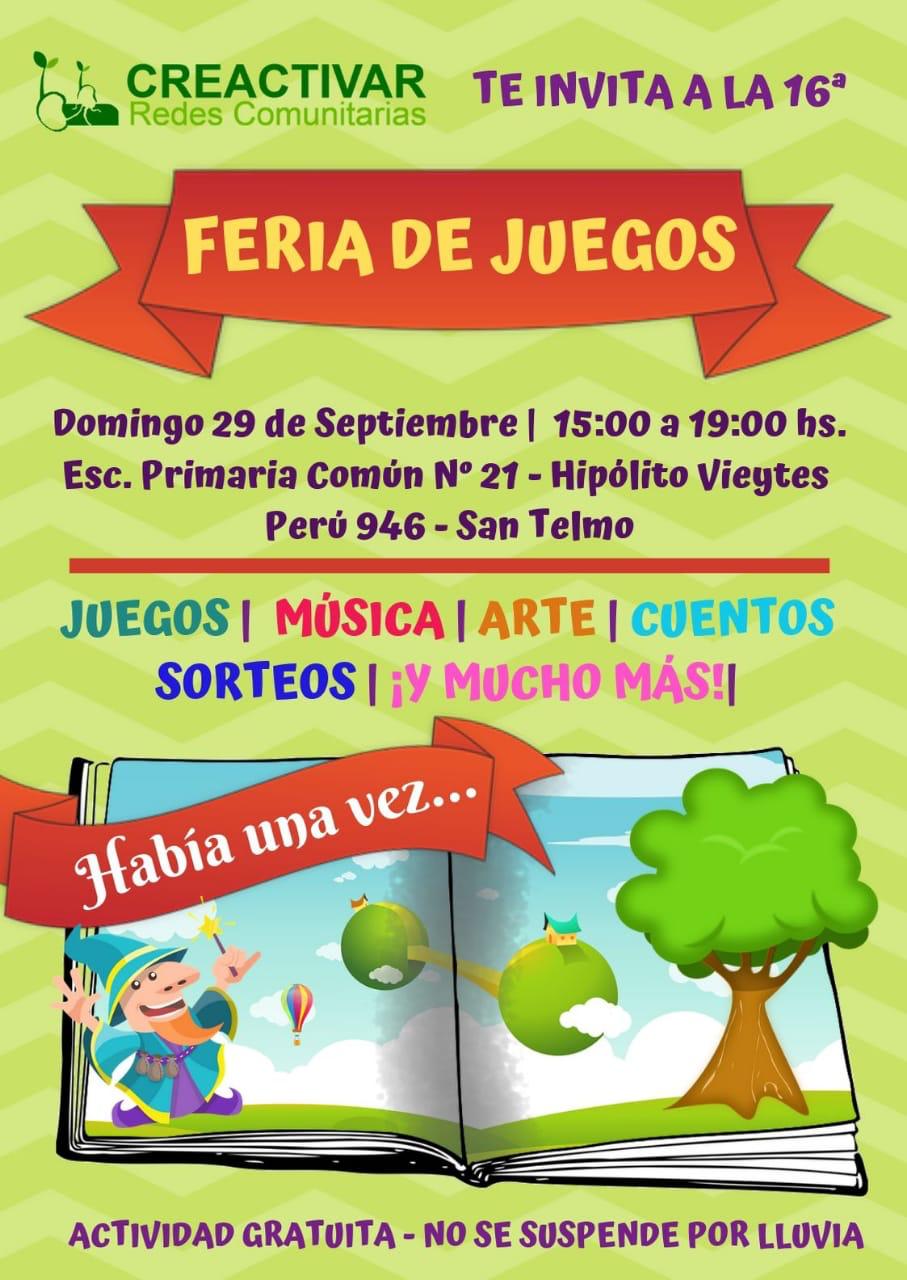 La Feria de Juegos funcionará de 15 a 19 horas en la Escuela Primaria Común N° 21 Hipólito Vieytes, ubicada en Perú 946, San Telmo. La Biblioteca Popular Infantil “Con Ternura Venceremos” participará del evento en el Aula 5, de 15 a 18 horas. Allí presentará su obra de teatro y títeres “Otra Caperucita Roja”