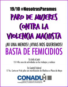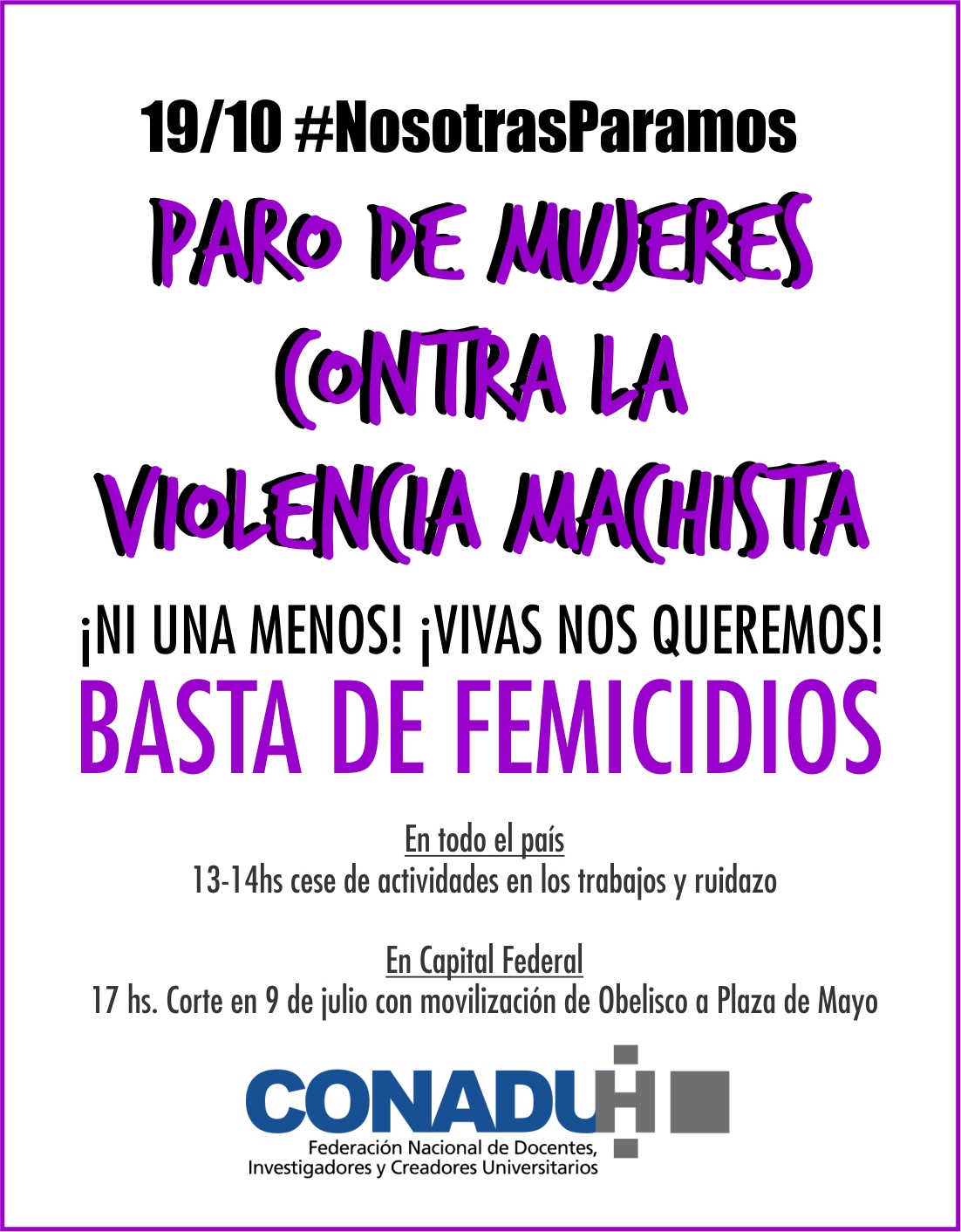 La CONADU Histórica adhiere a la convocatoria a Paro Nacional de Mujeres lanzado por más de 50 organizaciones luego que se conociera el brutal femicidio de Lucía, de apenas 16 años, en Mar del Plata.