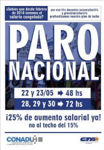 El Plenario de Secretarios/as Generales de la CONADU Histórica resolvió la continuidad y profundización del plan de lucha por la recomposición salarial del 25% ya con paros de 48 y 72 horas para los días 22 y 23 de mayo; y 28, 29 y 30 del mismo mes.