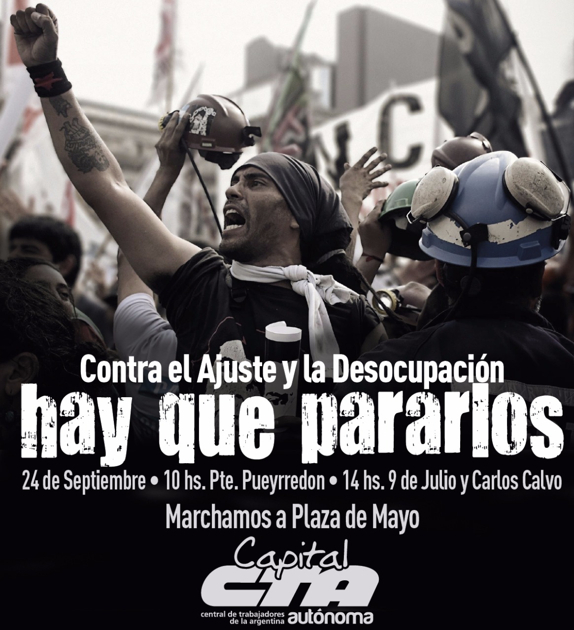 El día lunes 24 de septiembre, en el marco del Paro Nacional de 36 hs contra el ajuste macrista, desde la CTA Autónoma de la Capital realizaremos junto a organizaciones sociales un corte en el Puente Pueyrredón a las 10hs, para luego marchar a las 14 hs. desde Carlos Calvo y 9 de Julio hacia la Plaza de Mayo. El día 25 continuaremos con un paro activo, participando en cortes y movilizaciones en distintos puntos de la Ciudad.