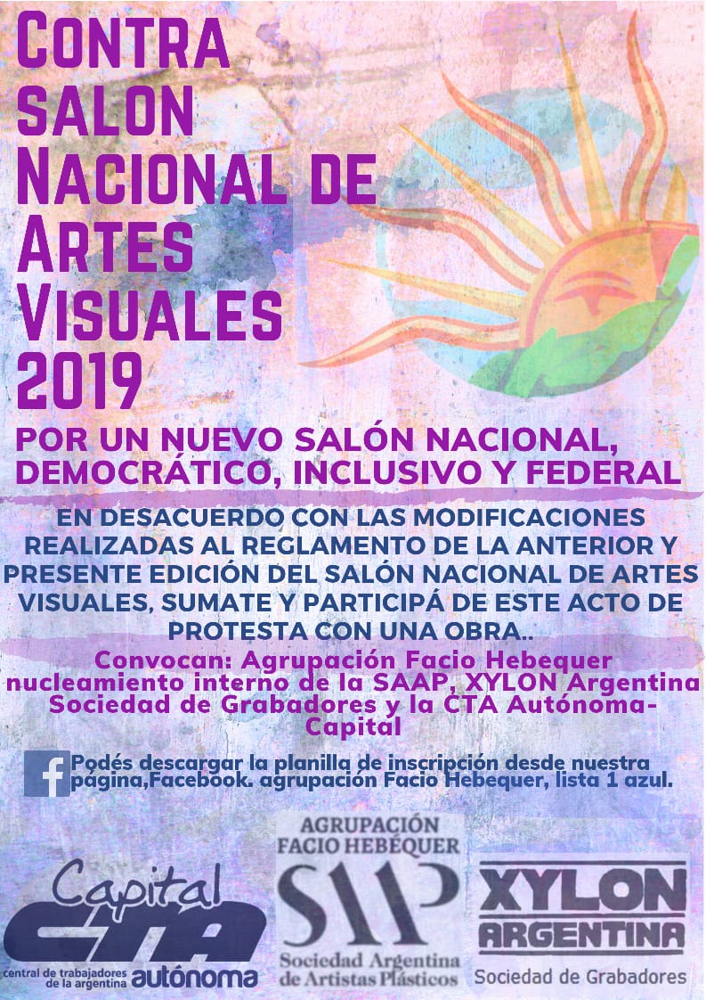 La agrupación Facio Hebequer, nucleamiento interno de la SAAP (Sociedad Argentina de Artistas Plásticos), XILON Argentina Sociedad de Grabadores y la CTA Autónoma-Capital, convocan a los artistas y profesionales de las Artes Plásticas a participar del Contrasalon Nacional de Artes Visuales 2019, en desacuerdo con las modificaciones realizadas al reglamento de la anterior y presente edición del Salón Nacional de Artes Visuales, que significan un gran ajuste, pérdida de los espacios disciplinares y restricción a la participación, entre otras.