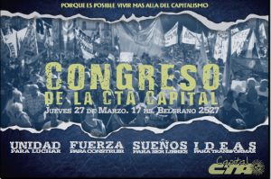 La Comisión Ejecutiva Provincial de la Central de Trabajadores de la Argentina de la Ciudad Autónoma de Buenos Aires, en el marco de la convocatoria a Congreso Nacional para el 4 y 5 de Abril resuelto por la Mesa nacional de nuestra Central y de acuerdo las normas estatutarias, convoca a los Delegados Congresales Provinciales a Congreso Extraordinario de CTA Capital para el día 27 de Marzo de 2014.