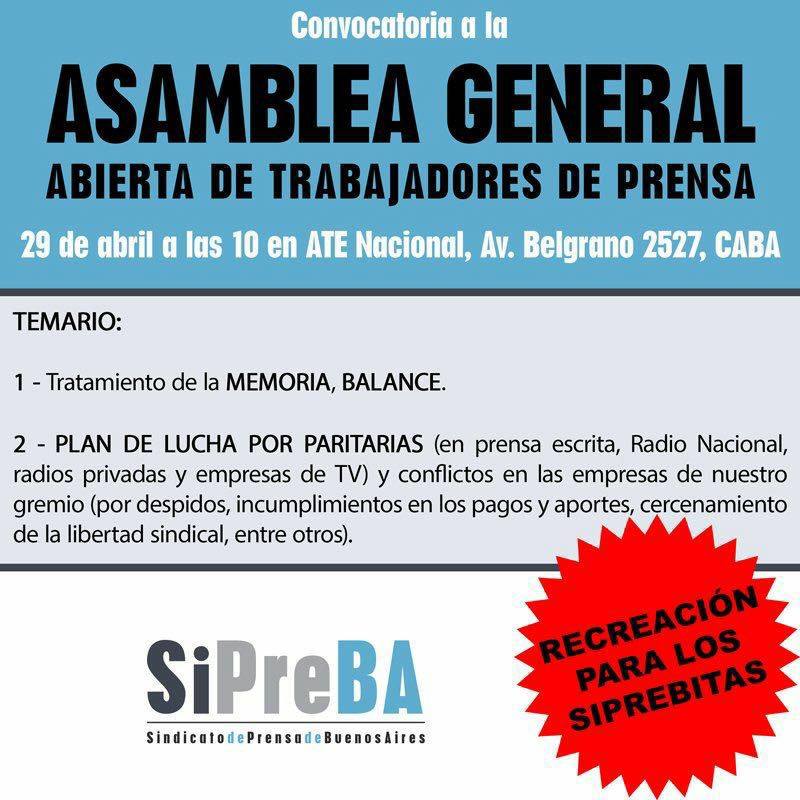 En cumplimiento del Estatuto Social, el Sindicato de Prensa de Buenos Aires (SiPreBA) convocó a Asamblea General Ordinaria y a Asamblea Extraordinaria para el sábado 29 de abril a las 10.00 en el Auditorio de ATE Nacional, Avenida Belgrano 2527, Balvanera.