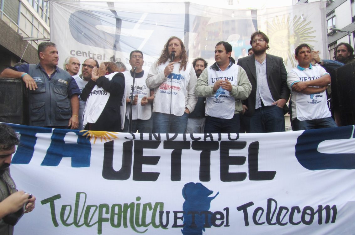 «Telefónica, tras varios años de conflicto con los trabajadores tercerizados, resolvió pasar a planta permanente a todo el plantel de una de las empresas contratistas (CHIC), menos al dirigente sindical Jorge Castro, quien encabezó las luchas por la organización del sector, contra la política de despidos y por mejorar las condiciones laborales. Hace tan solo algunos meses, gracias a la lucha de UETTel se logró reincorporar a 86 trabajadores y ahora la patronal decide dejar en la calle a su Secretario General.
