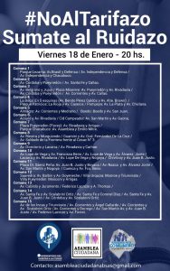 El viernes 18 de enero a las 20 horas se realizará una nueva protesta en distintos puntos de la Ciudad Autónoma de Buenos Aires y en el resto del país. La misma está convocada por el Observatorio del Derecho a la Ciudad, el Movimiento Comunero y la Asamblea Ciudadana. Por su parte, la CTAA Capital participará a través de sus Regionales Centro, Norte y Sur.