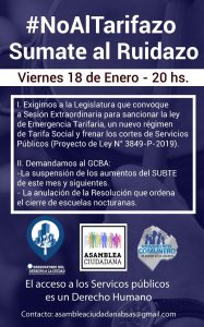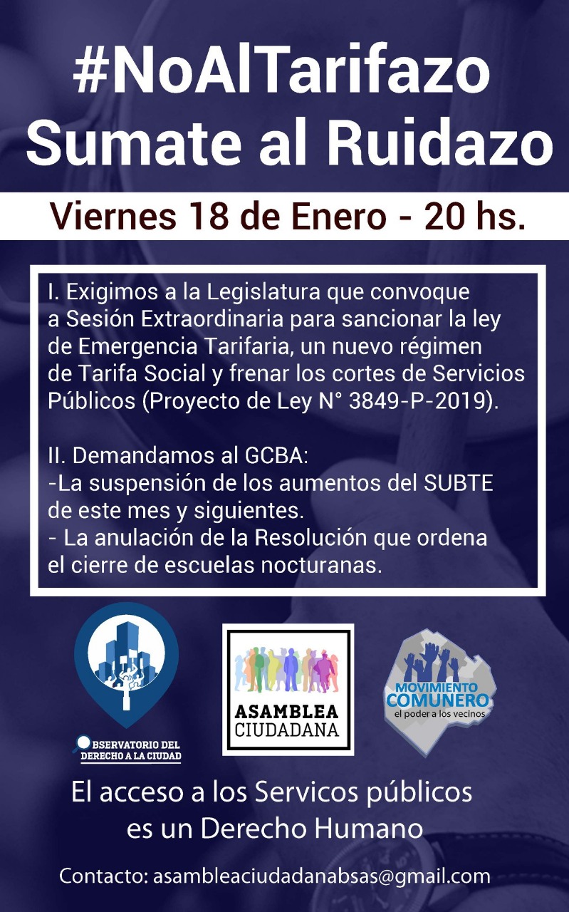 Se acerca otro viernes de ‘ruidazo’ en la Ciudad, al mismo tiempo que desde el Espacio Asambea Ciudadana -con el apoyo de la CTAA Capital y la Ctep- están exigiendo a la Legislatura el tratamiento urgente en Sesiones Extraordinarias del Proyecto de Ley N° 3849-P-2019, que tiene por objeto: declarar la Emergencia Tarifaria en la Ciudad de Buenos Aires, establecer un nuevo Régimen de Tarifa Social para los Servicios Públicos y frenar los cortes de los servicios públicos.