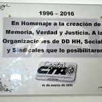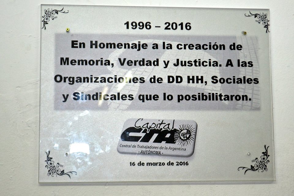 El pasado miércoles 16 de marzo se llevó a cabo en la CTA Capital un acto homenaje a los compañeros que hace 18 años presentaron pruebas ante el Juez Baltasar Garzón, en España, junto a la denuncia para que se declarara como genocidio el asesinato y desaparición forzada de miles de compatriotas. También, en el mismo acto se recordaron los 20 años de la creación del Espacio Memoria, Verdad y Justicia.
