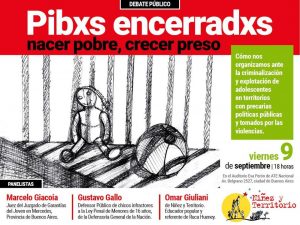 El viernes 9 de septiembre a las 18 horas en el Anfiteatro Eva Perón de ATE Nacional -Avenida Belgrano 2527- se realizará un debate público bajo la consigna “Pibxs encerradxs. Nacer pobre, crecer preso”, organizado por el Encuentro Niñez y Territorio.