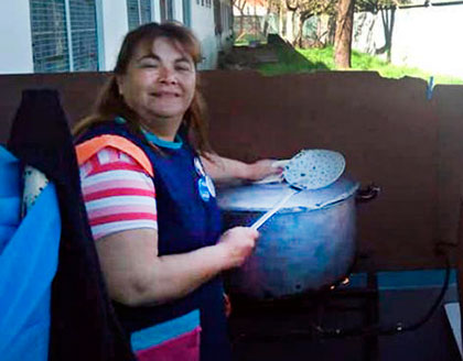 En este marco, Corina De Bonis junto a sus compañeras y compañeros docentes y auxiliares vienen sosteniendo ollas populares para que las niñas y niños de la zona puedan seguir comiendo mientras están las escuelas clausuradas.