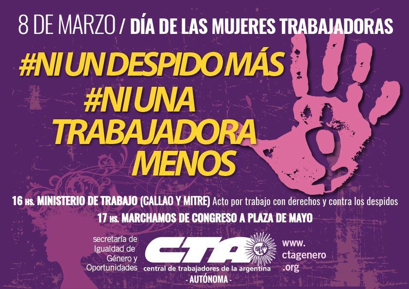 El próximo martes 8 de marzo las compañeras de la Central de Trabajadores de la Argentina Autónoma realizarán un acto por trabajo con derechos y contra los despidos, donde tomarán la palabra compañeras de la CTA A que fueron despedidas; luego marcharán de Congreso a Plaza de Mayo junto a otras organizaciones sociales, políticas y de mujeres.