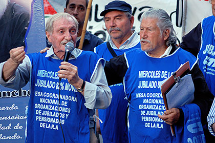 El Defensor de la Tercera Edad de la Ciudad de Buenos Aires, Eduardo Semino, fue uno de los primeros en tomar la palabra: “La jubilación no es sólo una lucha de nuestros viejos. No puede ser que el IVA que pagamos los trabajadores sea el que sostenga las jubilaciones y nada se diga de la renta minera y petrolera. Cuando se discute el impuesto al trabajo lo que no se quiere discutir es el impuesto a las ganancias. Es una sociedad que excluye a los chicos, a los viejos y a los jóvenes”.