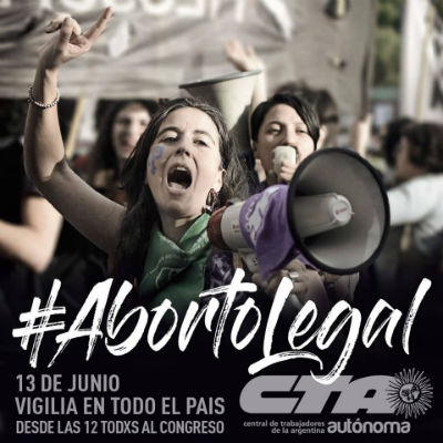 Este miércoles 13 de junio la CTA Autónoma junto a la Campaña Nacional por el Derecho al Aborto Legal, Seguro y Gratuito se concentrará desde las 12.00 frente al Congreso nacional para celebrar el debate y exigir la aprobación del proyecto de Ley de Interrupción Voluntaria del Embarazo, que ya fue presentado 7 veces en la Cámara de Diputados.