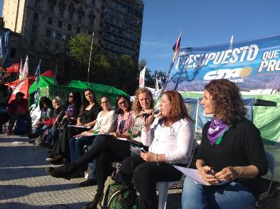 Frente al Congreso y en círculo, mujeres y varones de diferentes sectores de trabajo, se dieron cita para debatir cómo afecta el recorte presupuestario en la vida diaria de las mujeres, porque somos las mujeres las que sostenemos las dobles o triples jornadas de trabajo, los trabajos de cuidado que no se pagan y son invisibilizados,quienes nos encargamos de los comedores y también somos las mujeres las que seremos más perjudicadas con las políticas de ajuste.