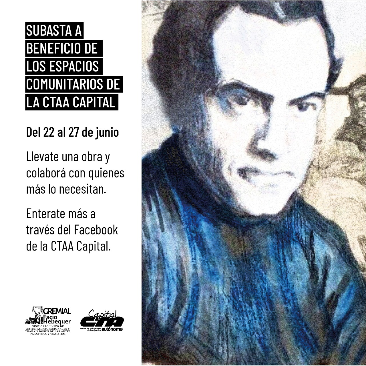 Entre los días 22 y 27 de junio inclusive, se realizará una subasta de arte organizada por la Gremial Facio Hebequer – Sindicato Único de Artistas, Profesionales y Trabajadores de las Artes plásticas y Visuales – CTAA a beneficio de los espacios comunitarios de la CTAA Capital. Todo lo recaudado se destinará a la compra de alimentos que posteriormente serán redistribuidos en los espacios territoriales.