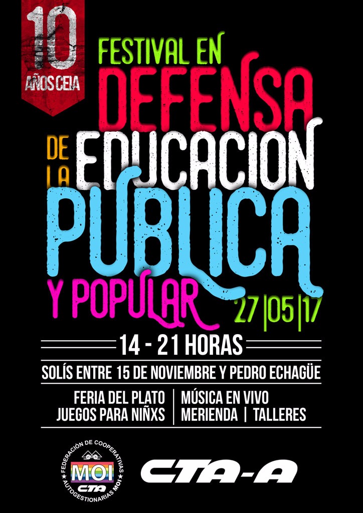 En defensa de la Educación Pública Popular, el Centro Educativo Integral Autogestionario (CEIA) del Movimiento de Ocupantes e Inquilinos (MOI-CTA) festejará los 10 años de su creación con un festival callejero el sábado 27 de mayo a las 14 horas.