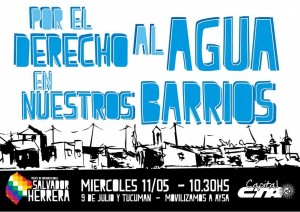 El Frente de Organizaciones Salvador Herrera -CTA convoca a los compañeros y compañeras a participar de la movilización que realizarán los habitantes de las Villas de la Ciudad de Buenos Aires, el próximo miércoles 11 de mayo a las 10.30 horas desde la Avenida 9 de Julio y Tucumán hasta las oficinas de Agua y Saneamientos Argentinos (AySa). Dicha marcha será para solicitar que se realice la entrega inmediata de agua potable envasada en todas los barrios de emergencia de la Ciudad donde no se garantice el suministro continuo de agua potable y que se modifique el contrato de concesión de la empresa para que se haga responsable del servicio de agua potable y saneamiento básico dentro de las villas de la CABA.