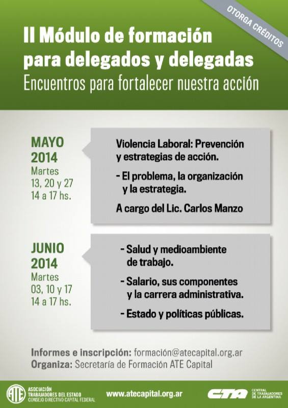 para subir a la web.redimensionadoLa secretaría de Formación de ATE Capital dio inicio al II Módulo de formación para delegados y delegadas el pasado martes 13 de mayo en el Auditorio Germán Abdala. Con la presencia de más de 50 compañeros y compañeras de distintos sectores de ATE, incluido el Secretario General José Luis Matassa, se dio pie a un nuevo módulo de formación que constará de seis jornadas entre los meses de mayo y junio y que tratará temas relacionados a la violencia laboral, la salud y el medioambiente de trabajo, el salario y la carrera administrativa y finalmente, el Estado y las políticas públicas desde su mirada como trabajadores.