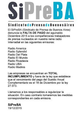 El Sindicato de Prensa de Buenos Aires (SiPreBA) denuncia la falta de pago del aguinaldo Diciembre 2015 a los compañeros/as trabajadores de prensa nucleados en nuestra rama radio Interradial.
