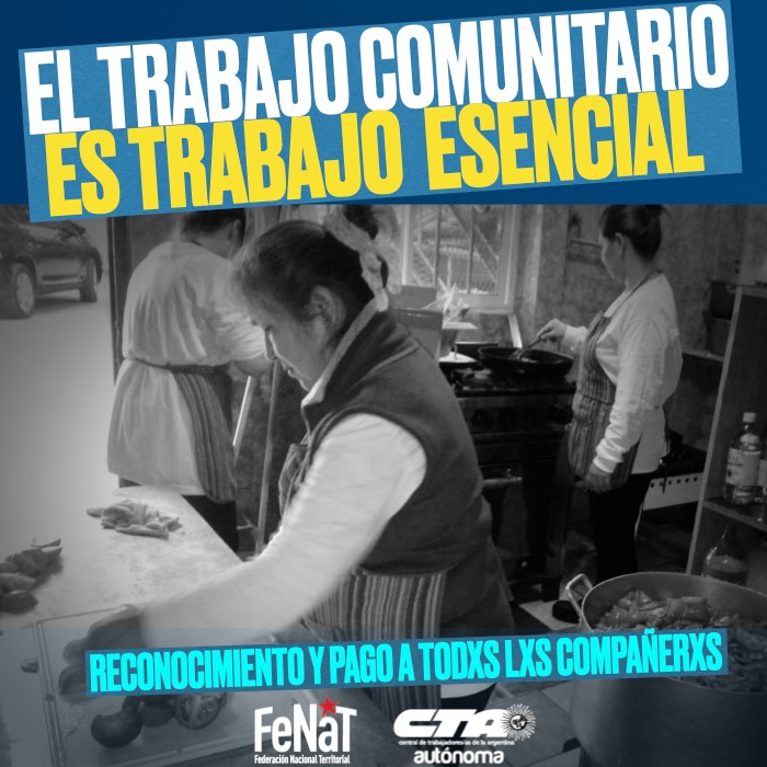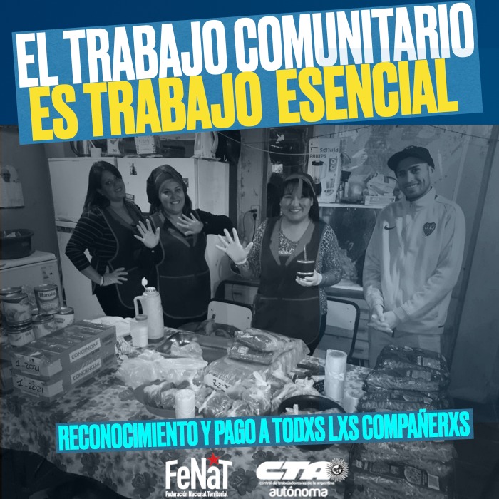 Organizaciones del territorio nucleradas en la Federación Nacional Territorial (FeNaT-CTAA) iniciaron una campaña para visibilizar el trabajo comprometido de cientos de compañeros y compañeras en medio de la pandemia. Reclaman que esta labor se reconozca como trabajo esencial y se pague.