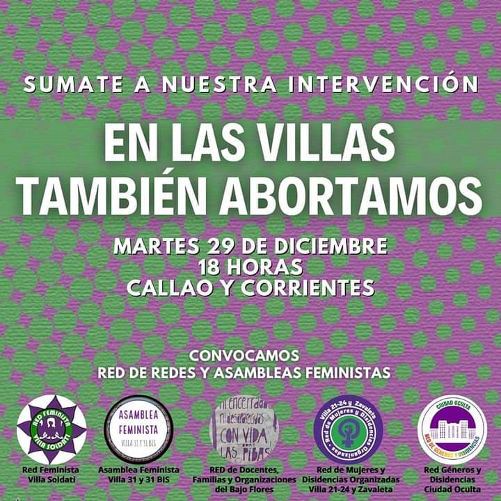 Este histórico 29 de diciembre estaremos acompañando a nuestras compañeras de villas y barrios populares en la intervención artística por el derecho al aborto que realizarán en Callao y Corrientes a las 18 horas, convocada por la Red de redes y asambleas feministas.