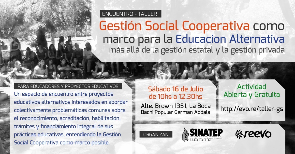 El Sindicato de Trabajadores y Trabajadoras de la Educación Popular y Gestión Social Cooperativa – CTA Capital y la Red de Educación Alternativa Reevo harán una actividad abierta y gratuita el próximo sábado 16 de julio entre las 10 y las 12.30 en el Bachi Popular Germán Abdala (Almirante Brown 1351, La Boca), sobre la Gestión Social Cooperativa como marco para la Educación Alternativa más allá de la gestión estatal y la gestión privada.