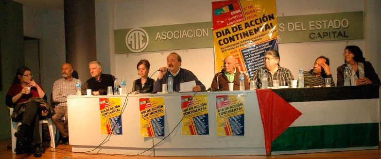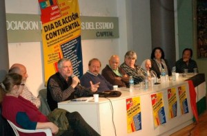 La jornada que comenzó pasadas las 18hs. tuvo lugar en el edificio de ATE Capital. La bienvenida a los presentes estuvo a cargo de Néstor Ricardo Llano por el Consejo Directivo de ATE Capital Federal. A continuación, inauguró y coordinó la actividad el co-Secretario General de la Federación Judicial Argentina e integrante de la Coordinación continental del ESNA, Víctor Mendibil, quien invitó a subir al escenario al panel, conformado por: Carlos Chile, secretario de Organización de la Mesa Nacional de la CTA; Carla Rodríguez integrante del Movimiento de Ocupantes e Inquilinos y de Mesa de la CTA de la Capital Federal; Tilda Rabi, presidenta de la Federación de Entidades Argentino Palestina; Hugo Blasco, secretario de Derechos Humanos de la Mesa Nacional de la CTA y Secretario General de la Asociación Judicial Bonaerense; Beverly Keene, integrante de Dialogo 2000 – Jubileo Sur; José Rigane, secretario Adjunto de laCTA y secretario General de la Federación de Trabajadores de la Energía de la República Argentina; Nora Cortiñas, presidenta de la Asociación Madres de Plaza de Mayo (Línea Fundadora) y Julio C. Gambina, Director del Instituto de Estudios y Formación de la CTA.