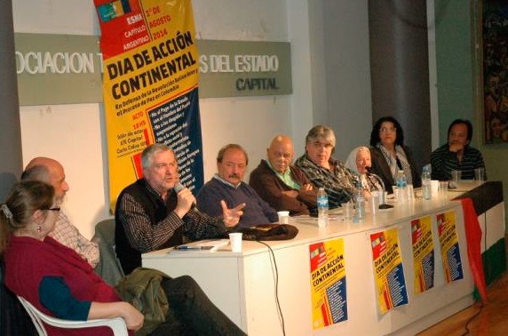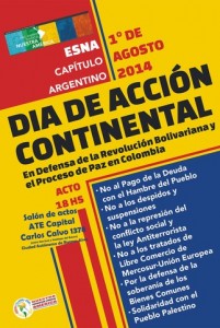 Con un auditorio colmado de trabajadores, representantes de movimientos sociales, sindicatos y organismos de derechos humanos se realizó el pasado viernes 1º de Agosto, un nuevo encuentro del ESNA–Capítulo Argentino, bajo el lema “Día de Acción Continental, en defensa de la Revolución Bolivariana y el Proceso de Paz en Colombia.”