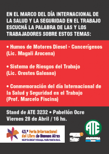 En el marco del Día Internacional de la Salud y la Seguridad en el Trabajo, este viernes 28 de abril a las 16 horas en el Stand de la Asociación Trabajadores del Estado (ATE-CTA), 3232 Pabellón Ocre de la Feria del Libreo, se realizará una charla sobre este tema. Participarán de la misma la Licenciada Magalí Arocena, el Licenciado Orestes Galeano y el Profesor Marcelo Fiscina, secretario de Salud Laboral de la CTA Capital.