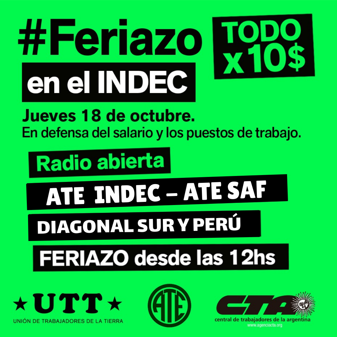 La Junta Interna de ATE-INDEC, junto a lxs compañerxs de la Secretaría de Agricultura Familiar (SAF) y la Unión de Trabajadores de la Tierra (UTT), convocan al feriazo que se va a desarrollar en la puerta del Instituto Nacional de Estadística y Censos, el próximo jueves 18 a partir de las 12.00 en defensa del Salario y los puestos de trabajo.