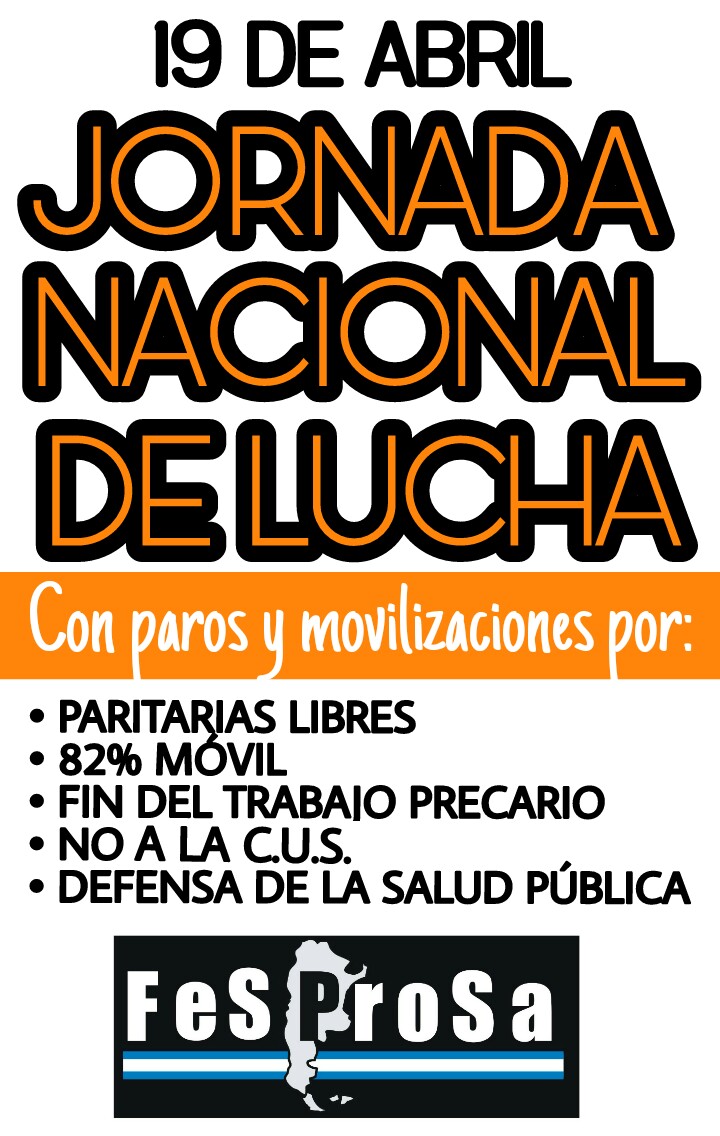 El Consejo Ejecutivo Nacional de la Federación Sindical de Profesionales de la Salud de la República Argentina (FESPROSA-CTA) convoca a Jornada de Lucha Nacional con paros y movilizaciones este miércoles 19 de abril, apoyando a sus regionales en conflicto, reclamando paritarias libres y sin techo, el 82 por ciento móvil para los jubilados del sector y el fin de la precarización laboral.